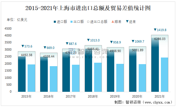 2015-2021年上海市進出口總額及貿易差值統計圖