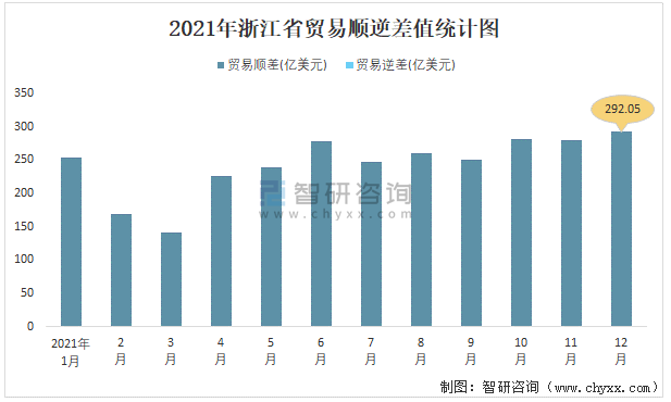 2021年浙江省進出口每月均呈現貿易順差狀態,其差值在12月達到最大值,2021年12月浙江省進出口貿易差值為292.05億美元。2021年12月浙江省進出口總額占全國比重為10.21%,相較于其他類型的企業,其中浙江省外商投資企業進出口總額占進出口總額比重為15.34%。