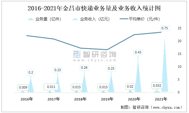 根據各省市郵政局數據可知:2021年12月金昌市快遞業務量為35.1萬件,業務收入為821.51萬元;2021年1-12月金昌市快遞累計業務量為321.29萬件,同比增長61.21%,累計業務收入為7509.94萬元,同比增長65.52%;2016-2021年金昌市快遞業務量總體呈現上升趨勢,業務收入總體呈現上升趨勢,平均單價2019年跌至最低,此后逐年遞增。