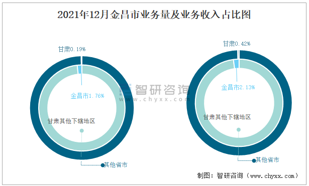 根據各省市郵政局數據可知:2021年12月金昌市快遞業務量占甘肅快遞業務量的1.76%,甘肅快遞業務量占全國快遞業務量的0.19%;2021年12月金昌市快遞業務收入占甘肅快遞業務收入的2.13%,甘肅快遞業務收入占全國快遞業務收入的0.42%。
