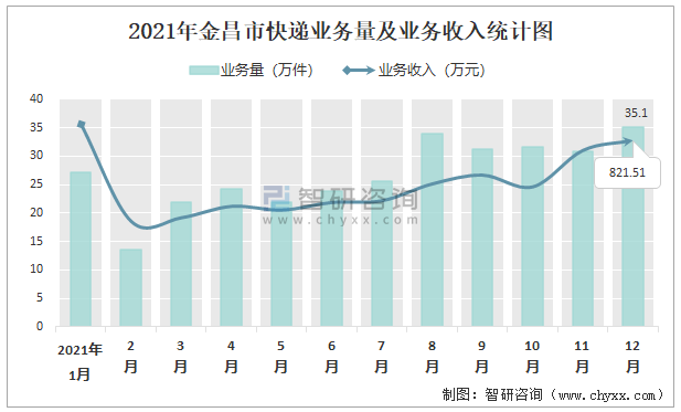 2021年12月金昌市快遞業務量與業務收入分別為35.1萬件和821.51萬元