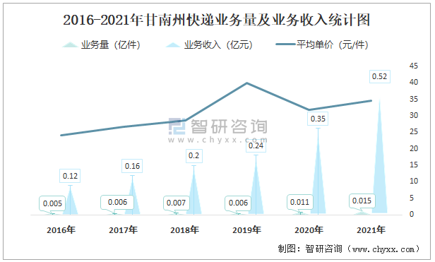 2016-2021年甘南州快遞業務量及業務收入統計圖