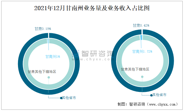 根據各省市郵政局數據可知:2021年12月甘南州快遞業務量占甘肅快遞業務量的1%,甘肅快遞業務量占全國快遞業務量的0.19%;2021年12月甘南州快遞業務收入占甘肅快遞業務收入的1.72%,甘肅快遞業務收入占全國快遞業務收入的0.42%。