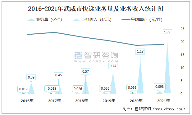 根據各省市郵政局數據可知:2021年12月武威市快遞業務量為71.39萬件,業務收入為1617.88萬元;2021年1-12月武威市快遞累計業務量為927.06萬件,同比增長47.03%,累計業務收入為17746.78萬元,同比增長49.95%;2016-2021年武威市快遞業務量與業務收入逐年遞增,平均單價總體呈現下降趨勢。