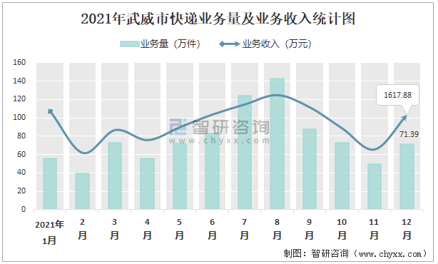 2021年武威市快遞業務量及業務收入統計圖