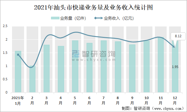 2021年汕頭市快遞業(yè)務量及業(yè)務收入統(tǒng)計圖