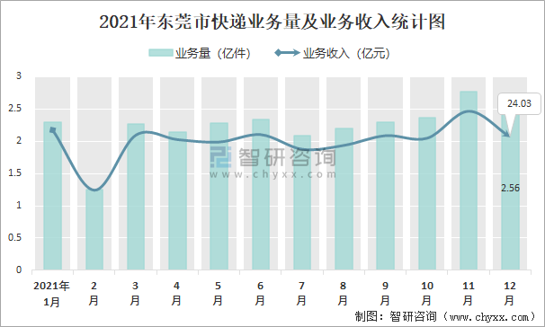 2021年?yáng)|莞市快遞業(yè)務(wù)量及業(yè)務(wù)收入統(tǒng)計(jì)圖
