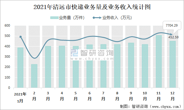 2021年清遠市快遞業務量及業務收入統計圖