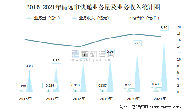 2016-2021年清遠市快遞業務量及業務收入統計圖