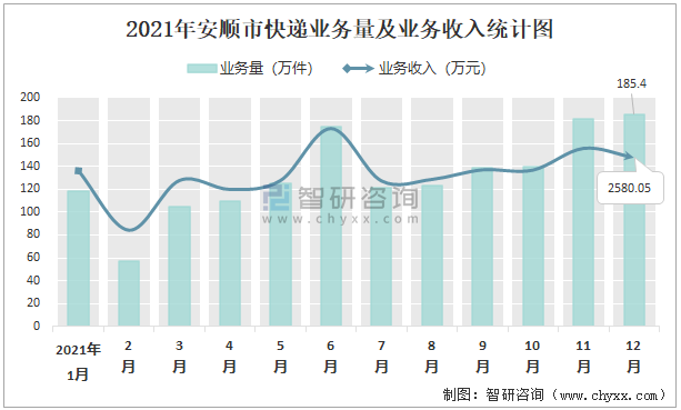 2021年安順市快遞業(yè)務(wù)量及業(yè)務(wù)收入統(tǒng)計(jì)圖