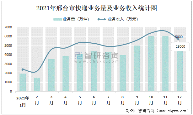 2021年邢臺(tái)市快遞業(yè)務(wù)量及業(yè)務(wù)收入統(tǒng)計(jì)圖