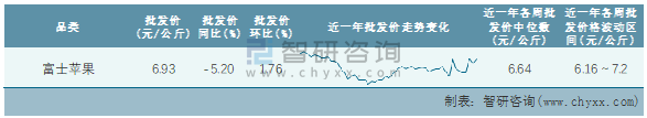 根據農村農業部數據統計可知:2022年第7周全國富士蘋果平均批發價為6.93元/公斤,同比下跌5.2%,環比增加1.76%,近一年全國富士蘋果平均批發價最高達到7.2元/公斤,批發價最低也要6.16元/公斤。