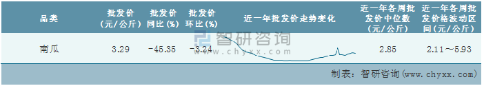 根據農村農業部數據統計可知:2022年第7周全國南瓜平均批發價為3.29元/公斤,同比下跌45.35%,環比下跌3.24%,近一年全國南瓜平均批發價最高達到5.93元/公斤,批發價最低也要2.11元/公斤。