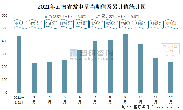 2021年云南省發電量當期值及累計值統計圖