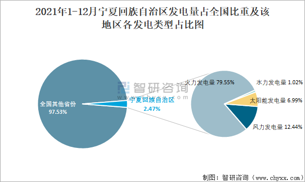 2021年1-12月寧夏回族自治區發電量占全國比重及該地區各發電類型占比圖