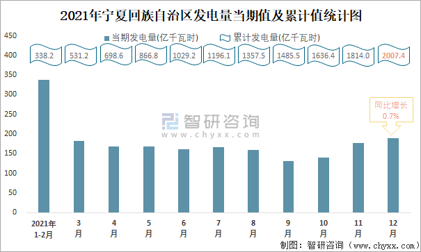 2021年寧夏回族自治區發電量當期值及累計值統計圖