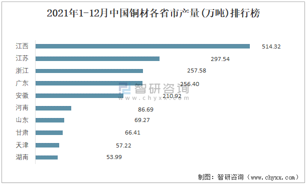 2021年1-12月中國銅材各省市產量排行榜
