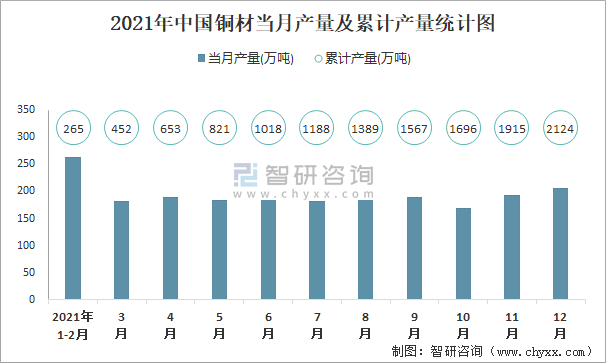 2021年中國銅材當月產量及累計產量統計圖