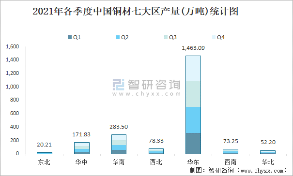 2021年各季度中國銅材七大區產量統計圖