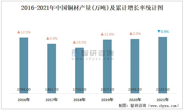 2016-2021年中國銅材產量及累計增長率統計圖