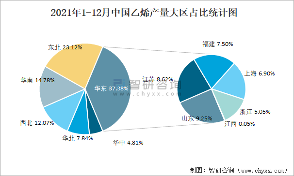 根據國家統計局數據顯示:2021年各季度中國乙烯主要集中在華東、東北、華南地區生產;2021年1-12月中國乙烯產量大區分布不均衡,其中華東地區產量最高,特別是山東省貢獻了最多產量;2021年1-12月中國乙烯各省市產量中遼寧和廣東兩省產量領先于其他省份。