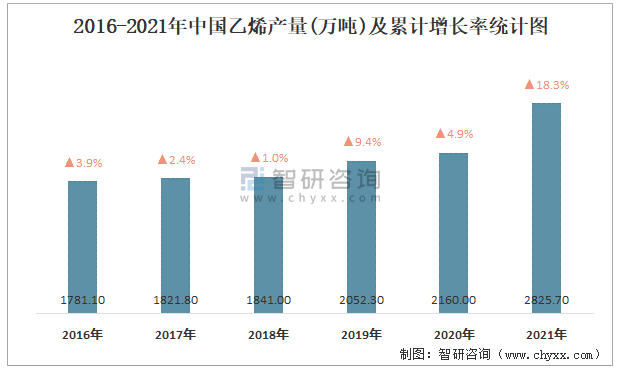 根據國家統計局數據顯示:2021年12月中國乙烯產量為245萬噸,同比增長2.5%;2021年1-12月中國乙烯累計產量為2825.7萬噸,累計增長18.3%;2016-2021年中國乙烯產量逐年遞增,2021年達到最高。