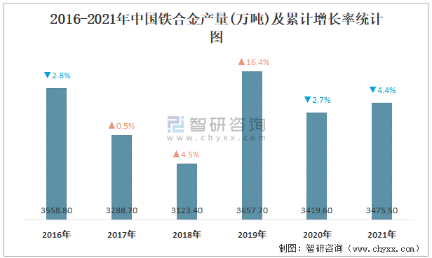 2021年1-12月中國(guó)鐵合金產(chǎn)量為3475.5萬(wàn)噸 累計(jì)下降4.4%