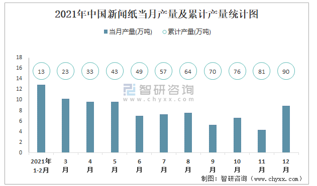 2021年中國新聞紙當月產量及累計產量統計圖