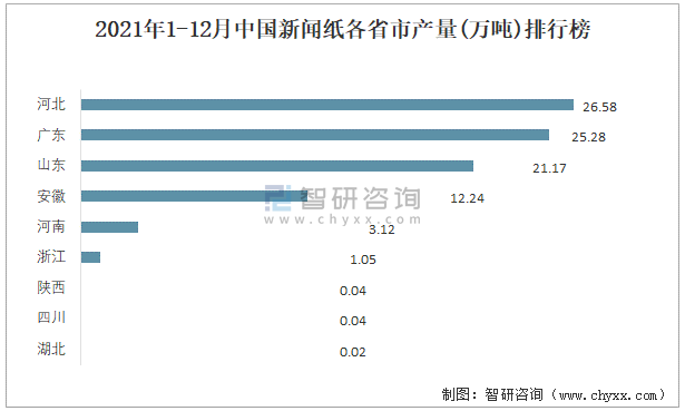 2021年1-12月中國新聞紙各省市產量排行榜