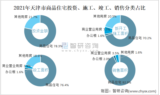 2021年天津市商品住宅投資、施工、竣工、銷售分類占比