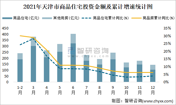 根據國家統計局數據統計可知:2021年12月天津市房地產開發投資商品房投資金額為145.74億元(其中商品住宅為104.88億元,辦公樓、商業營業用房等其他用房40.86億元);2021年天津市房地產開發投資商品住宅累計投資金額為2168.35億元,投資金額累計同比增長4%。