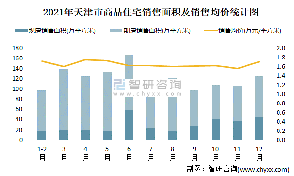 2021年天津市商品住宅銷售面積及銷售均價統計圖