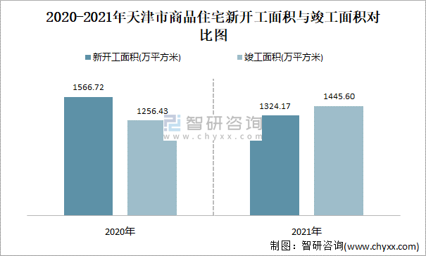 2020-2021年天津市商品住宅新開工面積與竣工面積對比圖