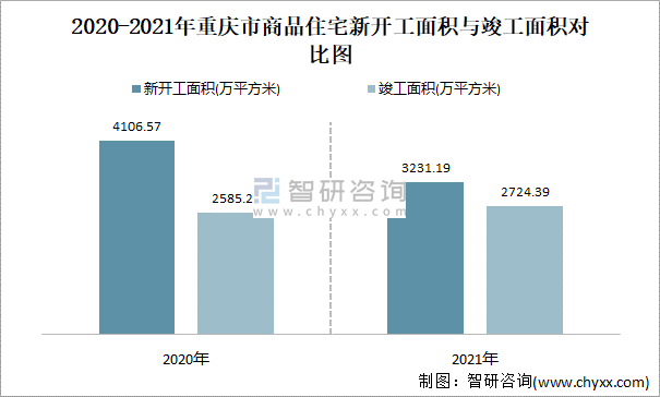 2020-2021年重慶市商品住宅新開工面積與竣工面積對比圖