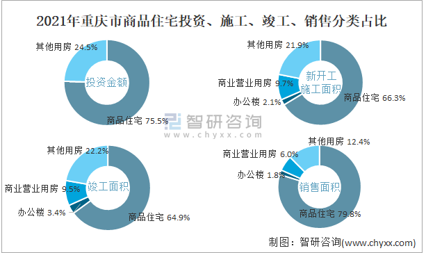 根據國家統計局數據統計可知:2021年重慶市房地產開發企業在商品住宅中投資金額占比為75.5%(注:只有投資金額中其他用房包含辦公樓、商業營業用房),商品住宅的新開工面積與竣工面積所占比重差異不大,從銷售面積來看,商品住宅為銷售主力(占比高達79.8%),辦公樓銷售面積占比少于商業營業用房銷售面積占比。