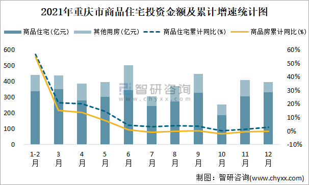 根據國家統計局數據統計可知:2021年12月重慶市房地產開發投資商品房投資金額為397.38億元(其中商品住宅為330.59億元,辦公樓、商業營業用房等其他用房66.79億元);2021年重慶市房地產開發投資商品住宅累計投資金額為3288.11億元,投資金額累計同比增長3.1%。