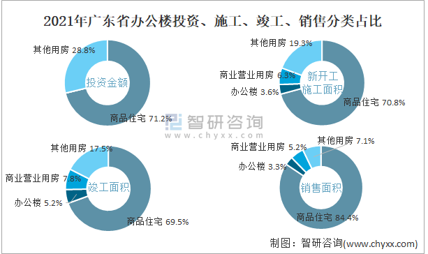根據國家統計局數據統計可知:2021年廣東省房地產開發企業在包括辦公樓在內的其他用房投資金額占比為28.8%(注:只有投資金額中其他用房包含辦公樓、商業營業用房),辦公樓的新開工面積與竣工面積所占比重差異不大,從銷售面積來看,辦公樓銷售面積占比少于商業營業用房銷售面積占比。