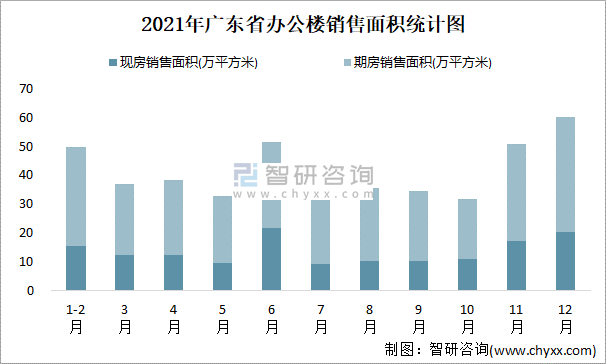 根據國家統計局數據可知:2021年廣東省辦公樓銷售面積為457.52萬平方米(其中銷售現房148.53萬平方米,銷售期房308.99萬平方米),2021年12月廣東省辦公樓銷售面積為60.21萬平方米;2021年廣東省辦公樓期房銷售面積遠高于現房銷售面積。