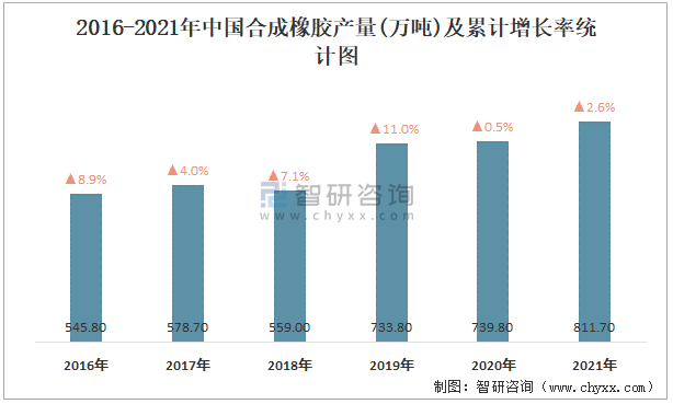 2016-2021年中國合成橡膠產(chǎn)量及累計增長率統(tǒng)計圖
