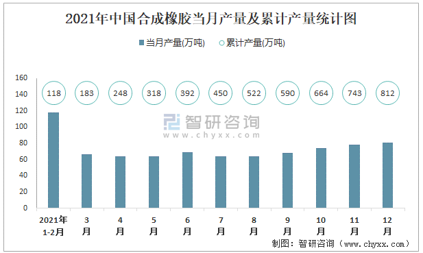 2021年中國合成橡膠當(dāng)月產(chǎn)量及累計產(chǎn)量統(tǒng)計圖