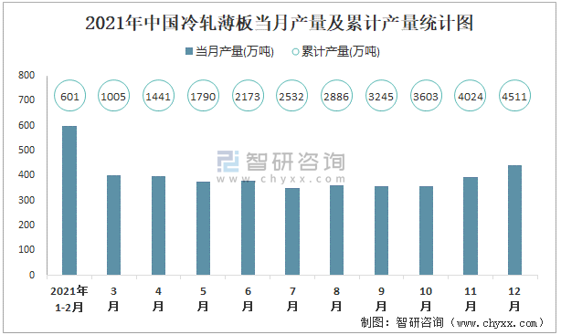 2021年中國冷軋薄板當月產量及累計產量統計圖