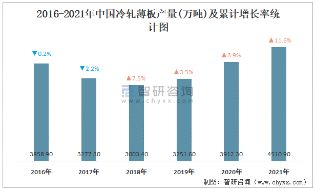 2016-2021年中國冷軋薄板產量及累計增長率統計圖