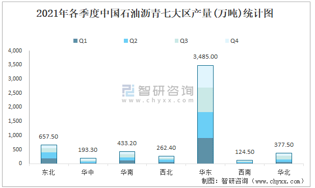 2021年各季度中國(guó)石油瀝青七大區(qū)產(chǎn)量統(tǒng)計(jì)圖
