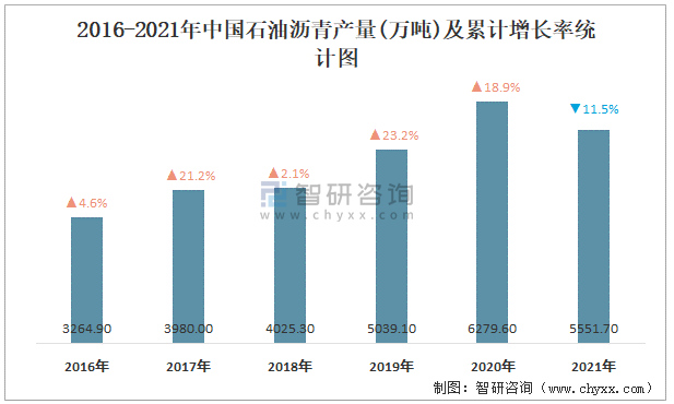 2016-2021年中國(guó)石油瀝青產(chǎn)量及累計(jì)增長(zhǎng)率統(tǒng)計(jì)圖
