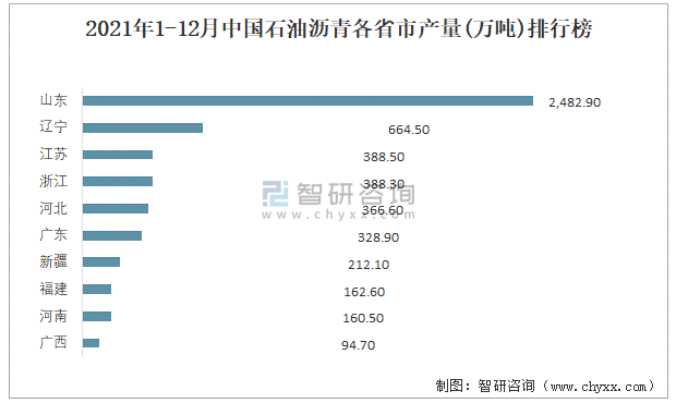 2021年1-12月中國(guó)石油瀝青各省市產(chǎn)量排行榜
