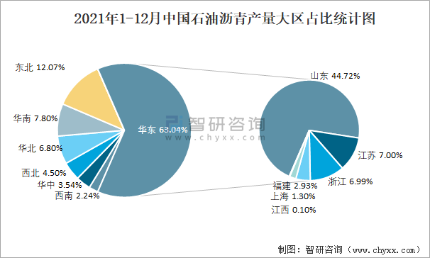 2021年1-12月中國(guó)石油瀝青產(chǎn)量大區(qū)占比統(tǒng)計(jì)圖