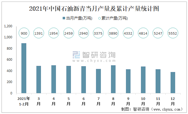 2021年中國(guó)石油瀝青當(dāng)月產(chǎn)量及累計(jì)產(chǎn)量統(tǒng)計(jì)圖