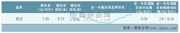 根據農村農業部數據統計可知:2022年第8周全國西瓜平均批發價為7.35元/公斤,同比增加8.73%,環比下跌5.41%,近一年全國西瓜平均批發價最高達到8.15元/公斤,批發價最低也要2.6元/公斤。