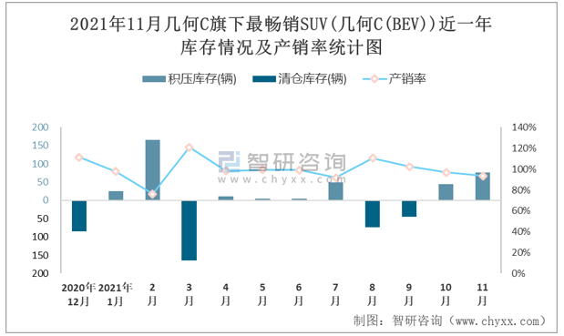 2021年11月幾何C旗下最暢銷SUV(幾何C(BEV))近一年庫存情況及產(chǎn)銷率統(tǒng)計(jì)圖