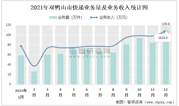 2021年12月雙鴨山市快遞業務量與業務收入分別為109.8萬件和1626.6萬元